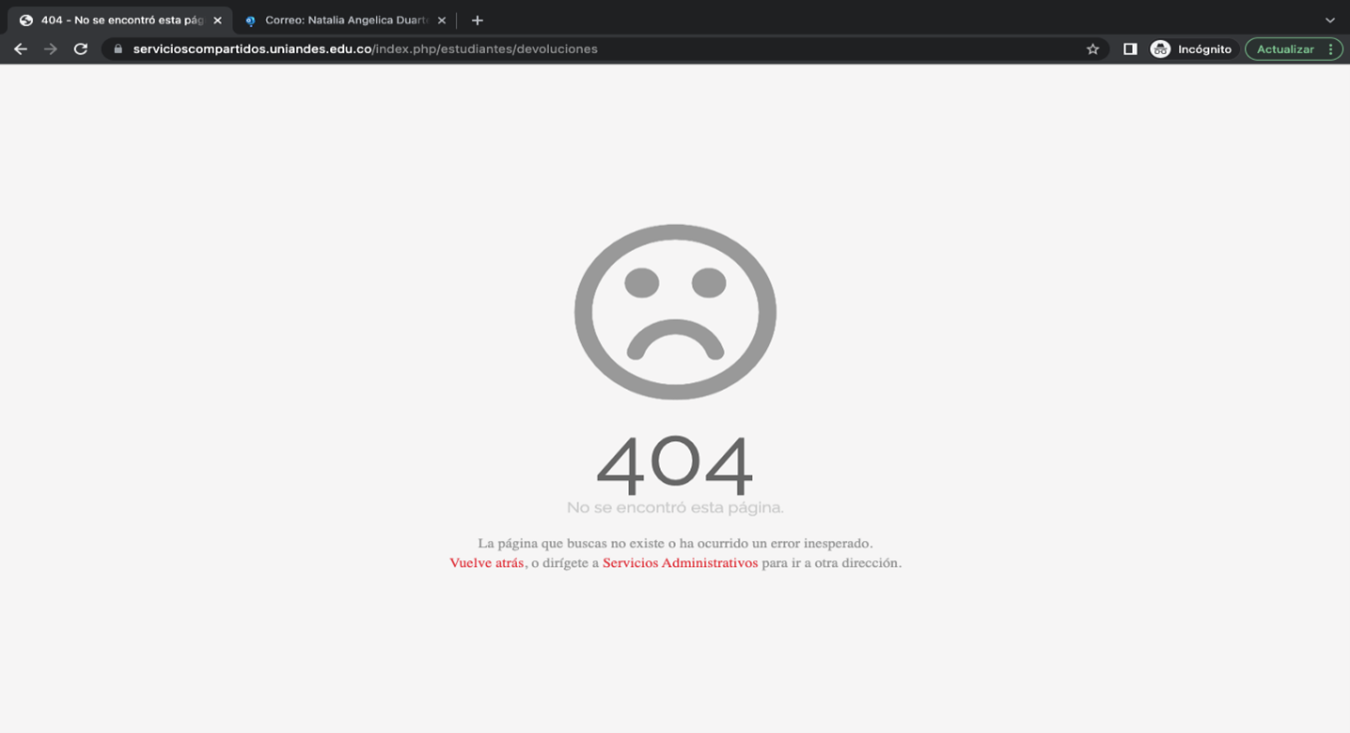 El formulario de devoluciones puede ser gestionado a través del link https://matriculas.uniandes.edu.co/devoluciones/formulario, ingresando por la opción de devoluciones. debe loguearse con el usuario únicamente, sin el dominio; es decir sin colocar el @uniandes.edu.co.